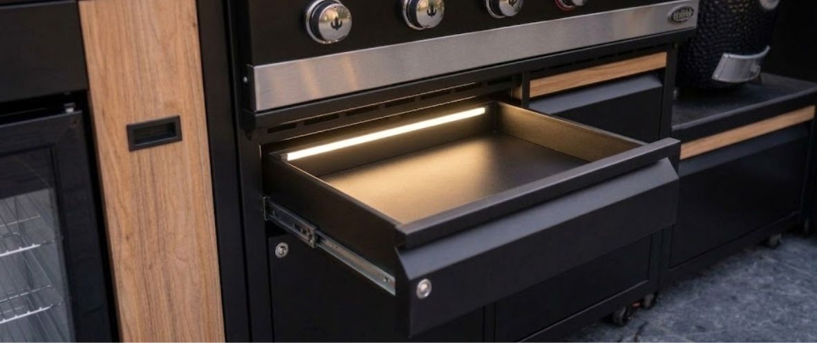 De GrillNest Pro Glow is specifiek ontworpen voor gebruik in de moderne buitenkeuken, maar door zijn slanke en minimalistische design misstaat hij in geen enkele kast of lade. De verlichting is vervaardigd uit hoogwaardig roestvrij staal (SS201), wat niet alleen zorgt voor een enorme duurzaamheid tegen de elementen, maar ook perfect matcht met de robuuste behuizing van onze buitenkeukens. Het is de finishing touch die jouw grillopstelling die felbegeerde luxe uitstraling geeft.