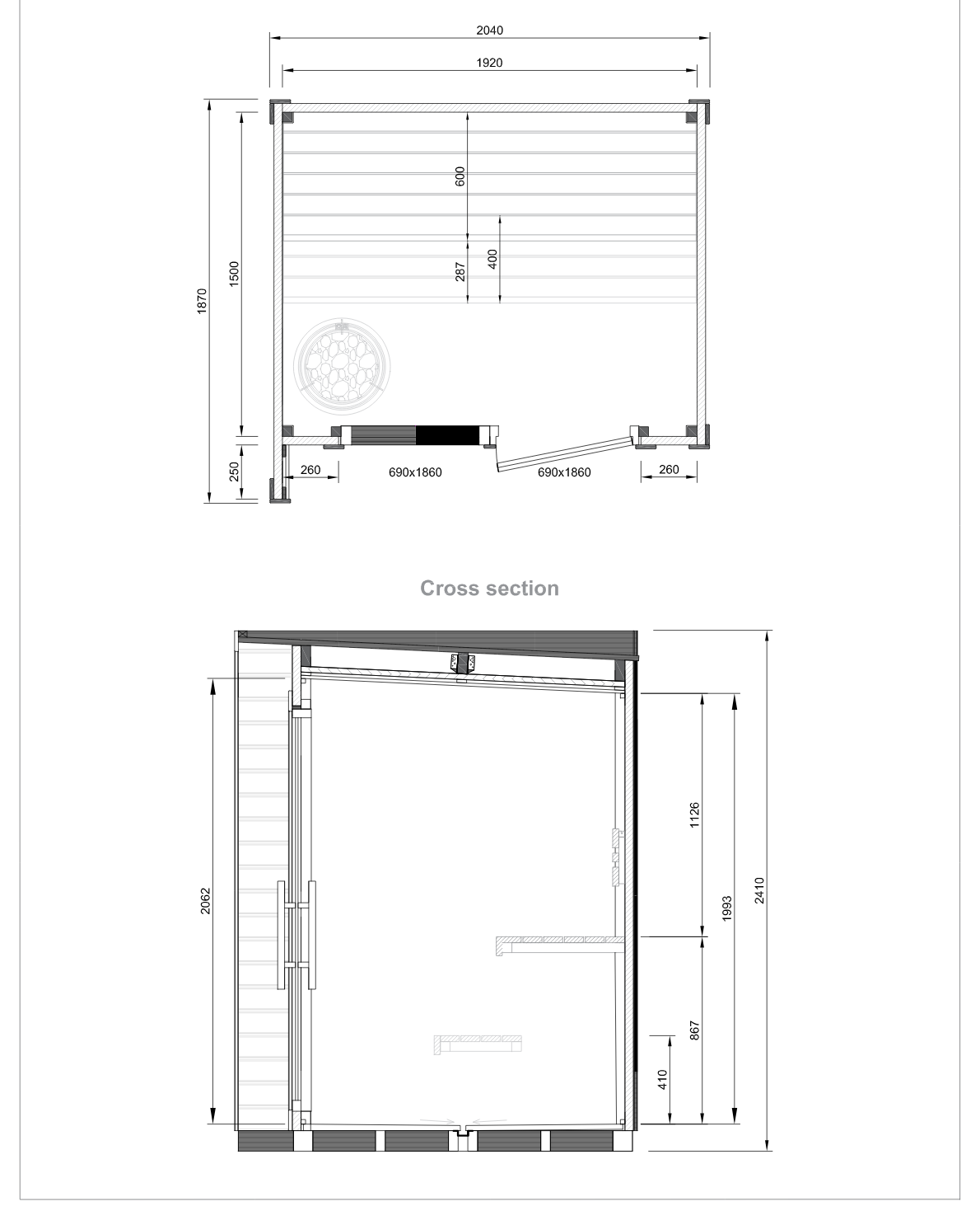 | Lengte saunaruimte | 200 x 200 cm buiten 192 x 192 cm binnen |