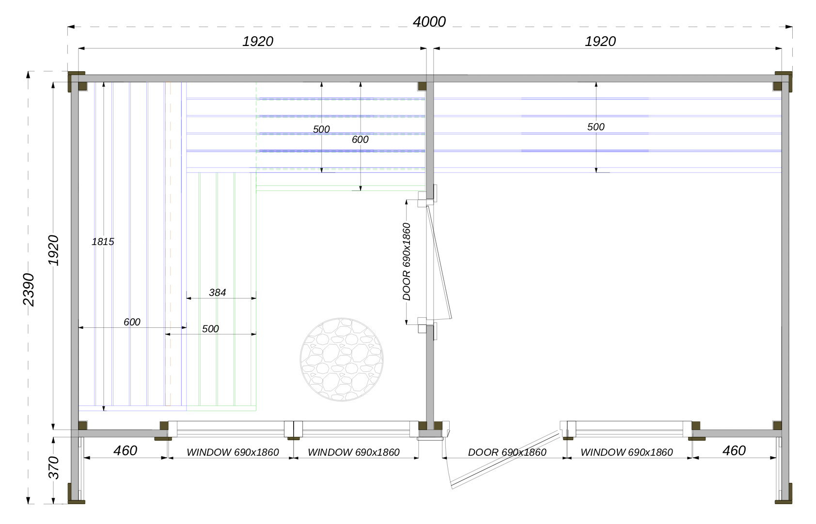 | Lengte saunaruimte | bovenste bank 192 cm x 60 cm + hoekbank 148,5cm x 60 cm - onderste bank 192 cm x 60 cm |