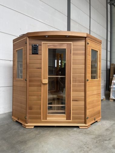 INFRAROODCABINE - INFRAPLUS™ 5 Hoek RED CEDAR - SHOWROOMMODEL DC ASTEN- Showroommodel Asten - V2 Bediening - Nieuw uit doos - 3 a 4-persoons hoek - Buitenafmetingen zie meer 150 cm * 190 cm H - InfraHeat™ Intence stralers 6 stuks - InfraHeat™ Carbon stralers 2 stuks - Compleet met Radio CD-speler - Dubbelwandig€ 3.199,00 incl. btw en bezorging -