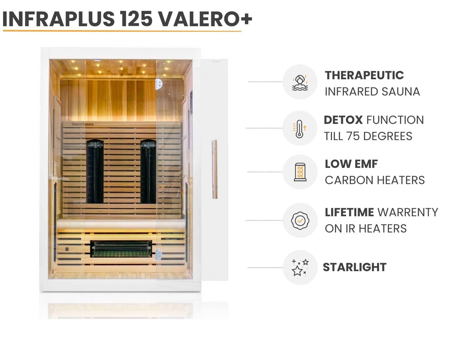 Onze 1-persoons combisauna 125 Valero past perfect in een modern interieur dankzij het strak design en het grote glazen front. Door de strakke afwerking van de sauna bestaat de mogelijkheid om de sauna in te bouwen, waardoor hij helemaal opgaat in uw interieur, maar ook als vrijstaande sauna geeft het een elegante look. Deze cabine is aan de buitenkant altijd in het wit afgewerkt. Zo is de cabine neutraal en naar wens te combineren & te integreren. De exacte kleurtint is RAL 9003 wit mat. U krijgt 6 Infraheat™ straler.