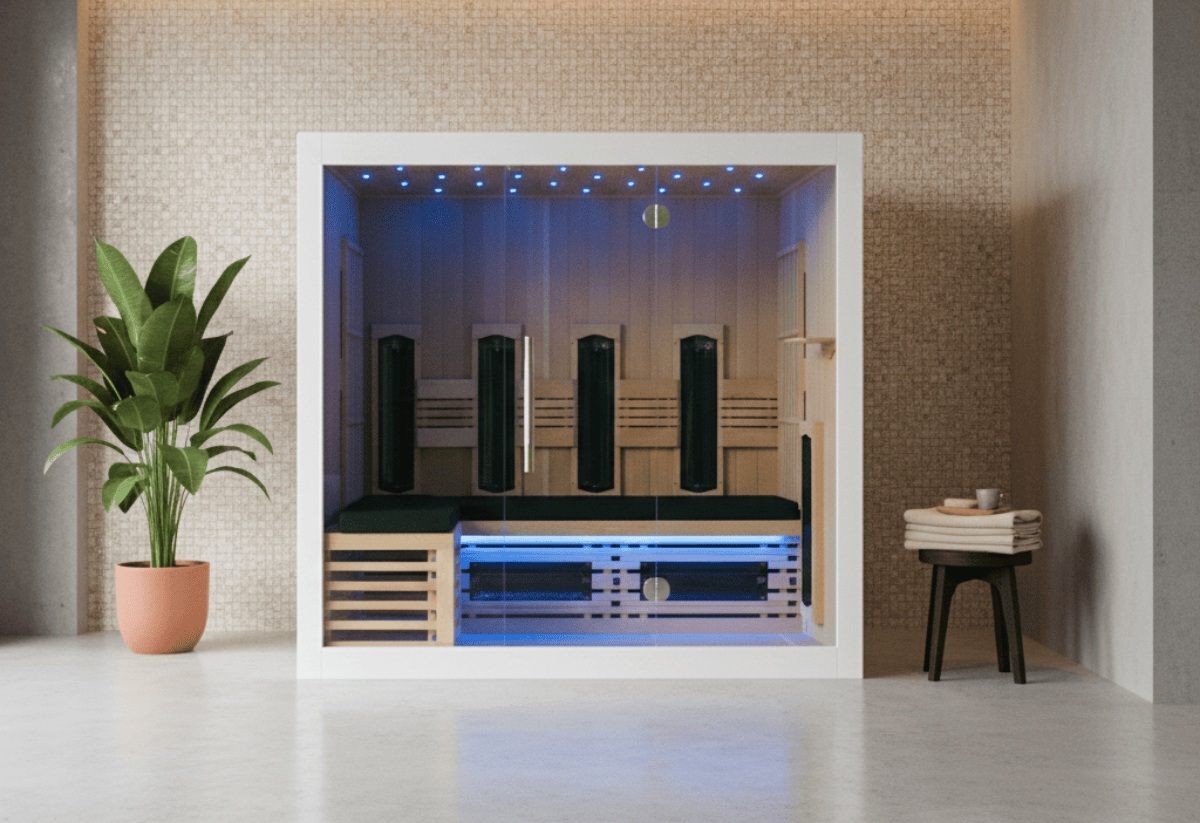 Onze 3-4-persoons infraroodcabine 185 Valero past perfect in een modern interieur dankzij het strak design en het grote glazen front. Door de strakke afwerking van de sauna bestaat de mogelijkheid om de sauna in te bouwen, waardoor hij helemaal opgaat in uw interieur, maar ook als vrijstaande sauna geeft het een elegante look. Deze cabine is aan de buitenkant altijd in het wit afgewerkt. Zo is de cabine neutraal en naar wens te combineren & te integreren. De exacte kleurtint is RAL 9003 wit mat. U krijgt er 9 Infraheat™ straler.