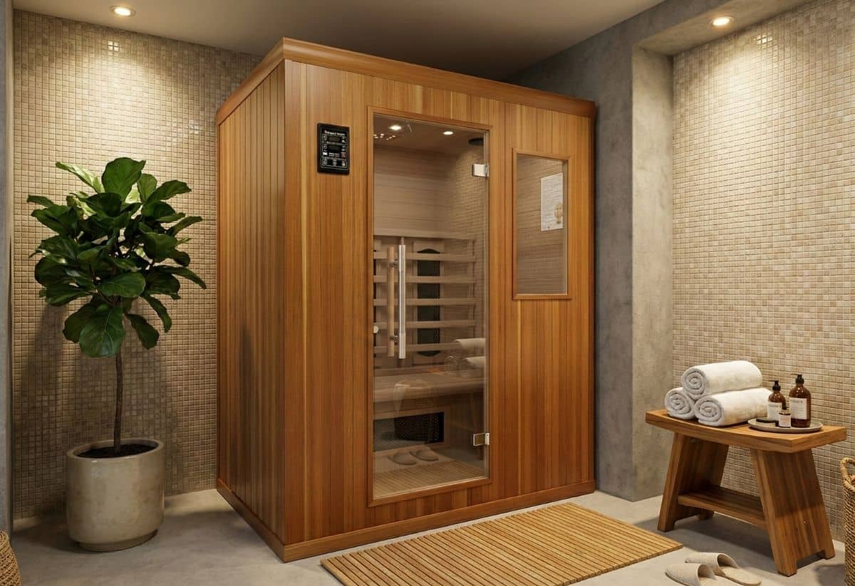 Onze 3-persoons infraroodcabine 3 Fysio is een speciale therapeutische infraroodcabine. Hierin vindt u 3 verschillende zitplaatsen. Achter het raam vindt u een zitplaats met een rugstraler en TWEE beenstralers. Aan de andere kant heeft u een zitplaats met een rugstraler en EEN rugstraler en in het midden vindt u nog een rugstraler. De cabine is aan de binnen- en buitenkant gemaakt van White Cedar of Canadees Red Cedar (meerprijs) en is uitgevoerd met 9 Infraheat™ straler.