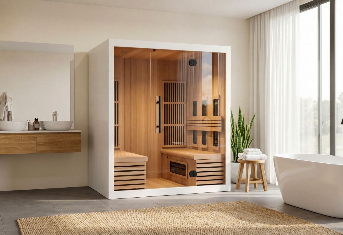 Onze 4-6-persoons infraroodcabine 6 Valero past perfect in een modern interieur dankzij het strak design en het grote glazen front. Door de strakke afwerking van de sauna bestaat de mogelijkheid om de sauna in te bouwen, waardoor hij helemaal opgaat in uw interieur, maar ook als vrijstaande sauna geeft het een elegante look. Deze cabine is aan de buitenkant altijd in het wit afgewerkt. Zo is de cabine neutraal en naar wens te combineren & te integreren. De exacte kleurtint is RAL 9003 wit mat. U krijgt er twee zitbanken tegenover van elkaar met totaal 4 tot 6 zitplaatsen. De cabine is uitgevoerd met 10 Infraheat™ straler.